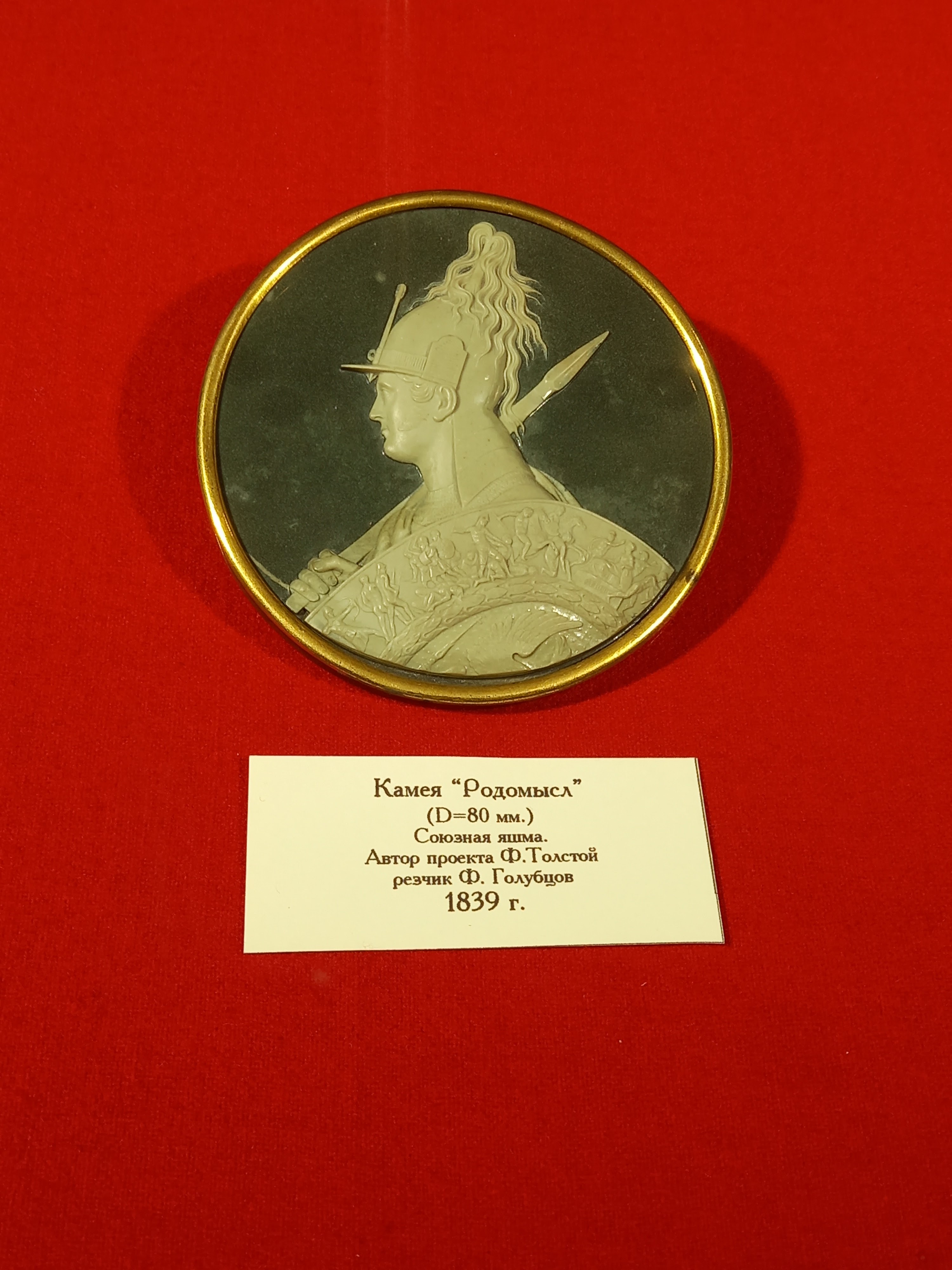 Много изделий из камня, в том числе камея "Родомысл", выполненная резчиком Федором Голубцовым по проекту Федора Толстого в 1839 году из союзной яшмы.